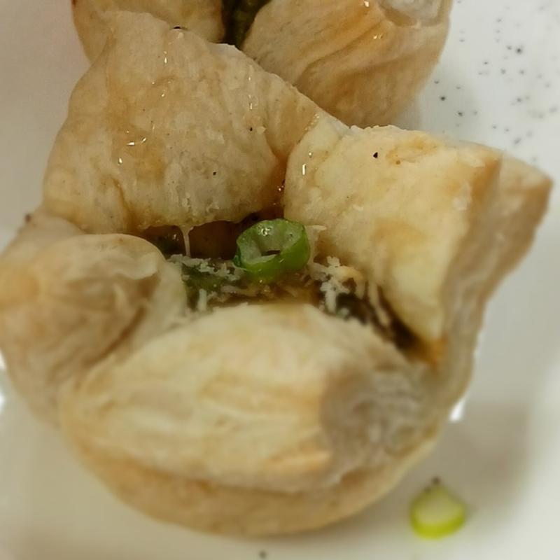 Filled with a creamy mixture of three cheeses, marinated artichoke hearts and spinach these buttery pastries are then baked to a crispy, savory golden brown then topped with a drizzle of local honey.