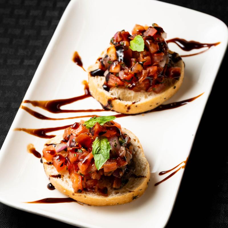 A timeless Italian appetizer featuring crispy toasted bread piled high with a refreshing blend of chopped tomatoes, and basil, finished with a hint of balsamic glaze
